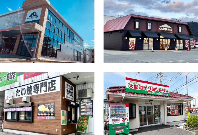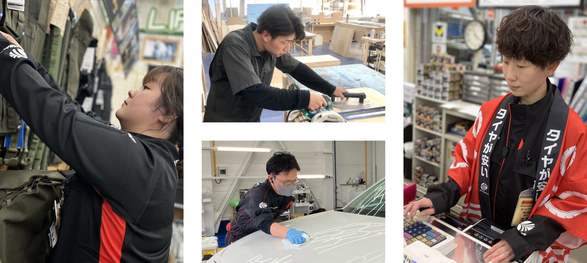 カー用品・自動車販売、車検・整備・修理・美装等、車関連事業を中心に、アウトドア専門店、ワークウエア専門店、たい焼き、洋菓子専門店等の店舗経営。