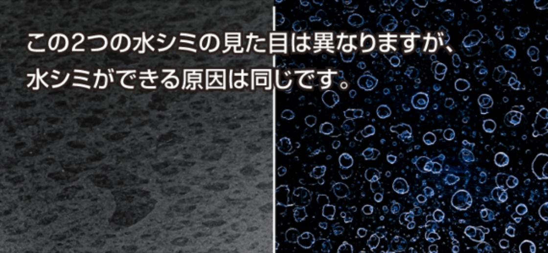 「水シミ」「水アカ」などは、水道水や地下水、泥水などに含まれる無機質の「ミネラル」が、水分が乾く過程でボディの上に付着し、何度も堆積して出来ます。従来の無機質のボディガラスコーティングの場合、ミネラルが無機質同士で定着しやすいので発生する現象です。しかしクリスタルキーパーのレジン被膜は”有機質”の性質を持っているため、「水シミ」などの定着を根本的に防ぐことに成功しています。
